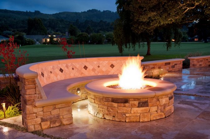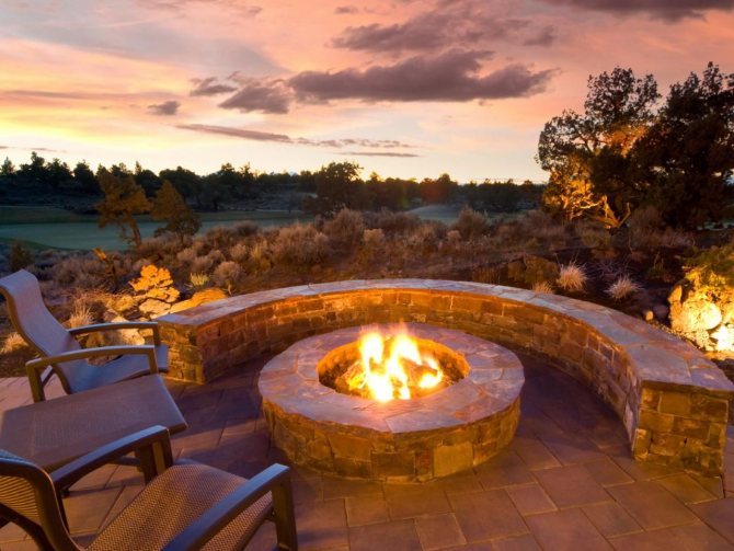 Особено внимание трябва да се обърне на зоната около огнището. Подът е изравнен и облицован с плочки, монтирани са градински мебели - плетени или дървени столове, пейки, маси, понякога те подреждат навес, който надеждно предпазва от дъжда.