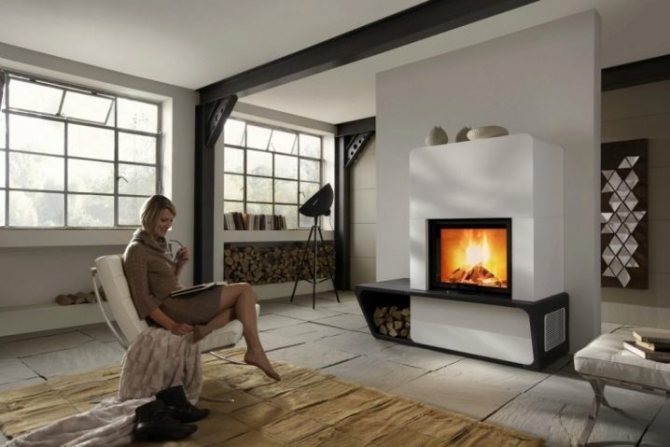 Бетонните камини, сглобени от блокове, са хармонично съчетани с естествено дърво в интериора