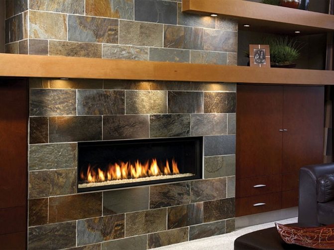 Подобен на дърво порцеланов камък е полезен за ниски рафтове над отворена камина. За разлика от MDF и дървото, той не се страхува от прегряване.