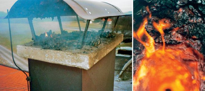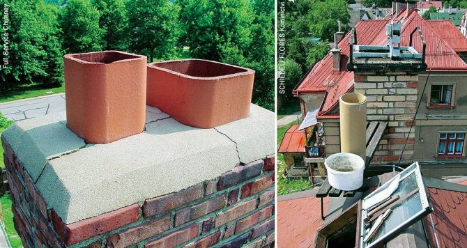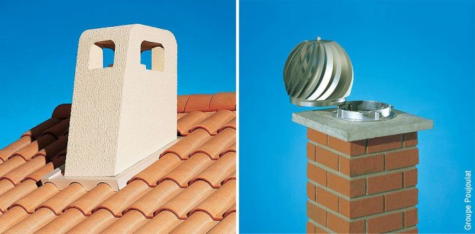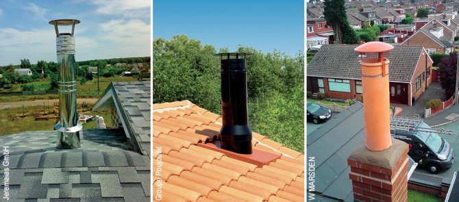 Независимо от материала, от който е направен коминът, разрезът на тръбата трябва да се издигне над външната повърхност на покрива до височина, препоръчана от нормативни документи - SNiP 41-01-2003, параграф 6.6.12; главата на конструкцията е увенчана с дефлектор, който доста ефективно предпазва канала от атмосферни валежи и увеличава тяговата сила поради всмукване на дим, използвайки вятърна енергия