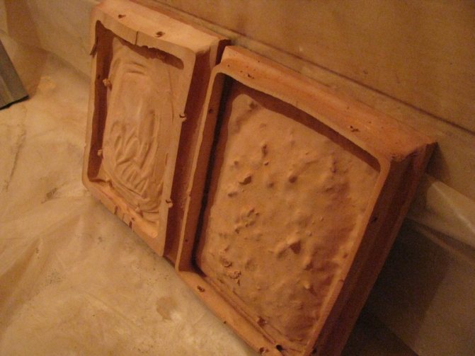 Първо, модел модел се покрива със смес, тънко. След това композицията се запълва в рамката до самия ръб. Отнема 15 минути, за да стегне мазилката. След четвърт час рамката се отстранява и формата се почиства, измива и изсушава. На този етап той вече може да се използва за направа на плочки.