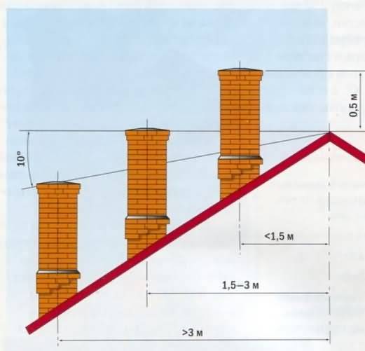 Така че, ако оста на комина е на разстояние до 1,5 м от билото, тогава тръбата трябва да се издигне на 0,5 м над билото. Ако разстоянието от комина до билото е от 1,5 до 3 м, тогава горната част на тръбата може да се изравнява с кънки. Ако разстоянието от тръбата до билото е повече от 3 м, се разрешава издигане на комин под билото на покрива под ъгъл от 10 градуса спрямо хоризонта.