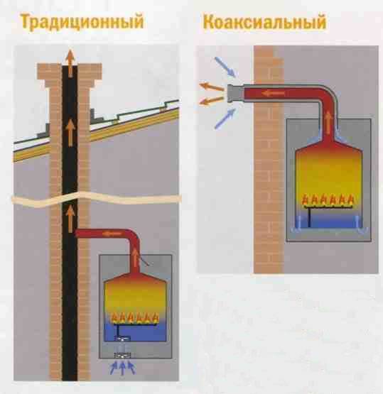 Лесно е да се досетим, че изхвърляният на улицата дим се състои от въздух, взет от стаята. Съответно запасите му трябва да бъдат попълнени, например взети от улицата. Това означава, че захранващият въздух ще бъде свеж, но студен. Някои системи решават проблема с отстраняването на полезен въздух. Котлите с принудителна тяга и вграден вентилатор са оборудвани с коаксиален комин, който се сравнява благоприятно с тръби от много метри. Този комин има две тръби. Свежият въздух от улицата навлиза в единия от тях, за да поддържа горенето, а от другия излиза дим. Системата е напълно затворена, тоест въздухът от помещението не участва в работата на котела. Подаването на въздух и изпускането на въздух не се извършват непременно през един комин, разделен на две части. Има и модели с отделни тръби. Често коаксиалните комини са хоризонтални, въпреки че при необходимост се прави и вертикален изход.