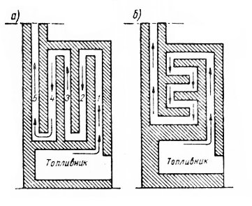 Тези пещи се нагряват много неравномерно, което може да бъде придружено от появата на пукнатини в зидарията поради неравномерното й разширение. Високата устойчивост по време на преминаването на газове изисква повишена тяга. Изобилието от завои благоприятства утаяването на саждите и почистването му е изключително трудно. Нискоскоростните системи имат един повдигащ канал и един или няколко понижаващи канала, свързани паралелно, тоест движението на дим по тях върви в същата посока (фиг. 63).