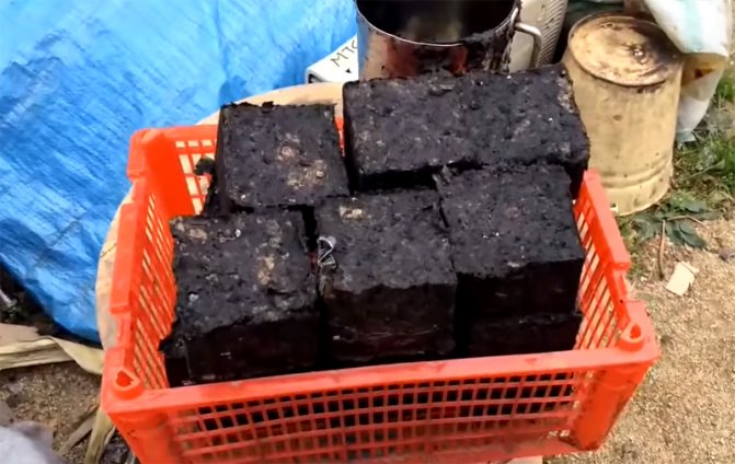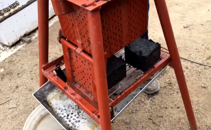 След повдигане на крика, капакът се отваря отдолу под отделенията и брикетите се изтласкват с помощта на битер. На външен вид това са обикновени черни кубчета. Всъщност, добре изсушеният брикет може да се превърне във въглища, които ще осигуряват топлина 4-6 пъти по-дълго от бреза. И това въпреки факта, че разходите за производство на такова гориво практически не се изискват - само малко вода и електричество за работа на пералната машина.
