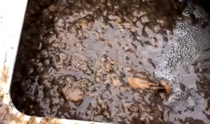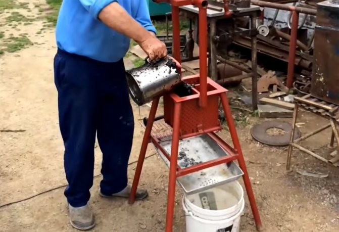 Сега трябва малко да изтъните масата. За да направите това, 2,5-3 кофи вода се изсипват в машината (тя се взема директно от банята). Между другото, за да се избегне твърде много консумация, течността, изцедена от суровината от пресата, също се събира в кофа и се връща във ваната.