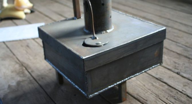 Първична горивна камера е направена от дъното. В него ще се излива отработено масло, което в процеса на контролирано изгаряне ще се нагрява и разлага на летливи фракции. Горната част на тази камера е затворена с 4 мм дебел кръгъл стоманен капак. Той трябва лесно да се отстранява, ако е необходимо, тъй като вътрешната повърхност на камерата трябва да се почиства старателно от шлаки всяка седмица.