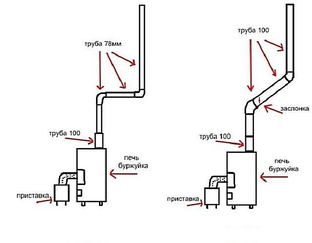 Инсталирайте вратите на горивната камера, след това го монтирайте върху подготвената основа. Когато горивната камера е готова, продължете с подреждането на комина. Може да се направи от тръби. Те трябва да бъдат съединени заедно с гнезда и всички шевове трябва да бъдат смазани с топлоустойчив уплътнител. Използвайте коляното си, за да направите извития участък.