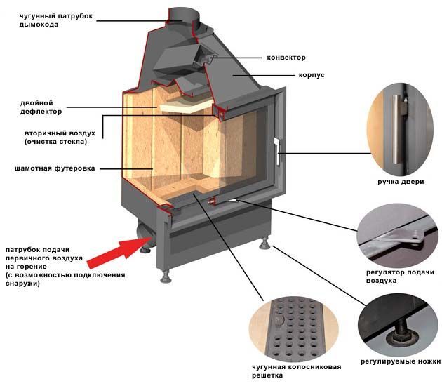Камината е свързана с комина, който премахва всички продукти от горенето от отоплителната система.За хармонично вписване на устройството във вътрешността на къщата, външната му повърхност може да бъде облицована с огнеупорни материали.