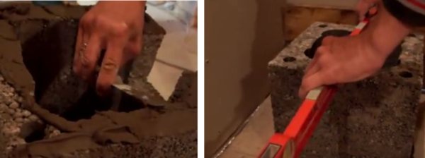 - Поставете блокове върху циментови разтвори или върху специално лепило, което е предназначено за продължителна работа при високи температури (около 1000 градуса). В инструкциите за такива лепила всичко трябва да бъде подробно описано, дали те могат да се използват за полагане на печки и комини. Зидарията се извършва по същия начин, както в случая със стандартна тухла: обличане в ъгли, раздалечаване на вертикални фуги и т.н. По време на работа използвайте отвес и строително ниво, за да подравните елементите хоризонтално. Ако въпреки това решите да използвате не лепило, а циментово-пясъчен хоросан, тогава той трябва да съответства степени не по-ниски от M50 - M75
