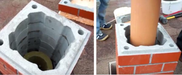 Изолацията трябва да бъде плътно положена между керамичната тръба и керамзитобетонния блок. Резултатът е композитен материал с висока якост с ниска топлопроводимост и идеално гладки топлоустойчиви канални стени.
