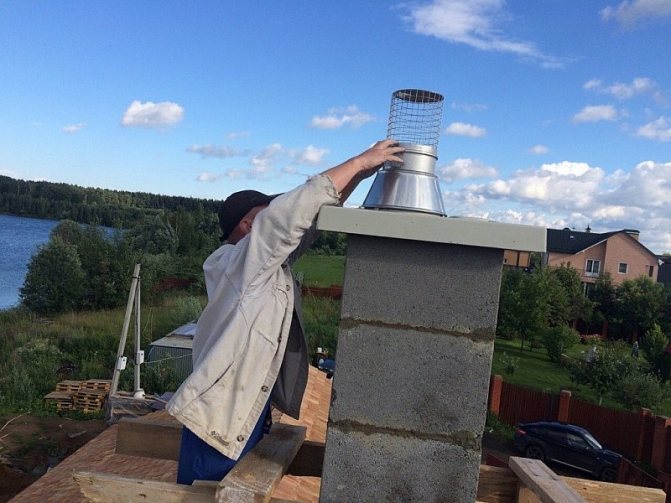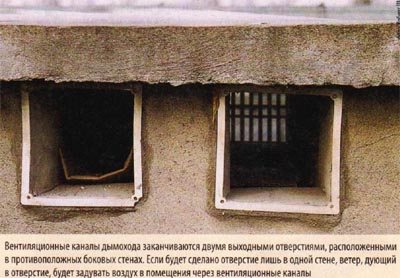Коминът трябва да бъде завършен със специален елемент - глава от бетон, подсилена с метални пръти за по-голяма надеждност. Краищата на главата излизат на около десет сантиметра извън контура на комина. За да се отстранят продуктите от горенето в главата, се правят дупки точно срещу димния канал или канал за отстраняване на летливите продукти от горенето. Изходите на вентилационните канали са разположени под самата глава, като правило, в страничните и срещуположните носещи стени на сградата. Вятърът може да бъде предотвратен по подобен начин. Параметрите на канала трябва да са не по-малки от размера на самия канал.