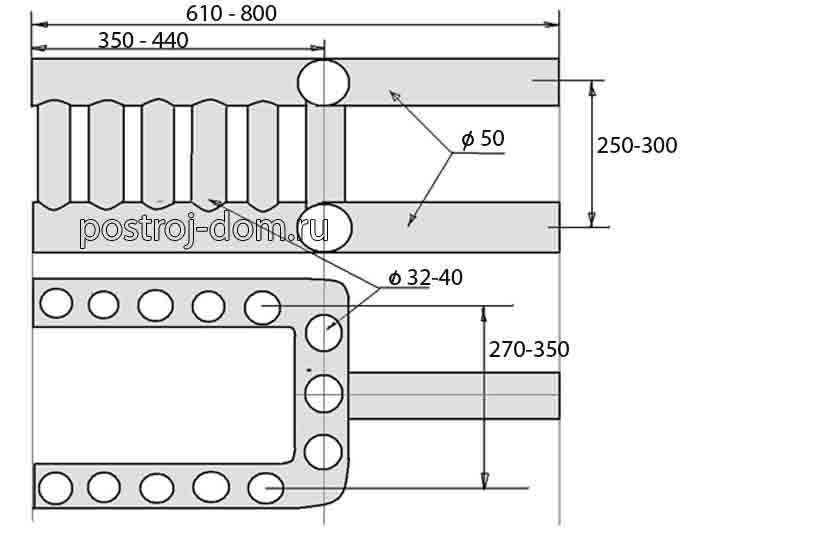Размерите на пещта в плана: ширина 2 тухли (51 см), дълбочина 2,5 тухли (64 см). Тъй като в него няма вентилационна камера, директно във вратата на пещта се пробиват отвори за всмукване на въздух.