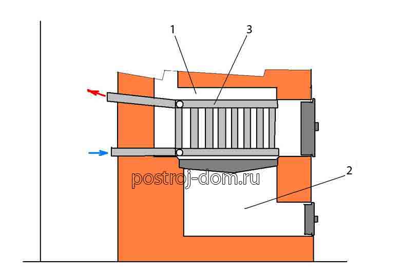 - Ако отоплителното устройство има вграден топлообменник, тогава поставянето на печката може да бъде всяко, при спазване на правилата за пожарна безопасност. Трябва обаче да се има предвид, че веригата на пещта трябва да действа като долната граница на отоплителната система.