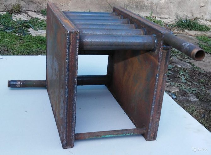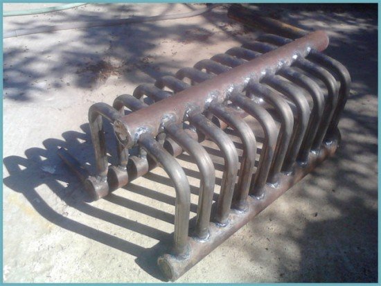 Този елемент трябва да бъде направен по поръчка. За производство, като правило, се използват стоманени тръби с дебели стени (от 3 мм), с диаметър 40-50 мм. Можете също така да заварявате водна риза от стоманена ламарина, за да премахнете топлината. Обикновено това е U-образна кутия, която се поставя вътре в камината и е нейните стени.