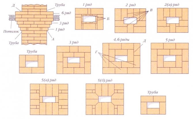 Яката е показана само с една контурна линия, така че да се вижда полагането на щранг G на тръбата. В ордерите на пиедестала над тръбния щранг 1-ви ред се поставя с припокриване D само над предната стена, което се вижда ясно от различен ъгъл - в ред. Никога не съм поставял 1-ви ред в средата на бордюра на четвъртинки, тъй като газовете отиват в средата на тръбата и когато в образуващата се вдлъбнатина се утаят много сажди в местата на липсващите квартали, ще дойде време за почистване на цялата тръба. Ако тръбата се почисти със зелена метла, саждите ще бъдат отстранени от всички ъгли. Обикновено четворките усложняват работата, след няколко години те обикновено падат от зидарията до дъното на газопроводите. Третият ред се поставя на 2-ри ред с превръзка. Пропуските над страничните стени се удължават и се правят вътрешни издатини в страничните стени, разширявайки димохода на това място. Така че с всеки ред на мястото, където има входове, размерът на газовия канал се увеличава. Освен това по протежение на дъската зидарията продължава с постоянно припокриване на непълни тухли. Четвъртият и петият ред са последните преди припокриването над задната стена. Те са над покрива, където в задната част на тръбата ще има желязна яка.