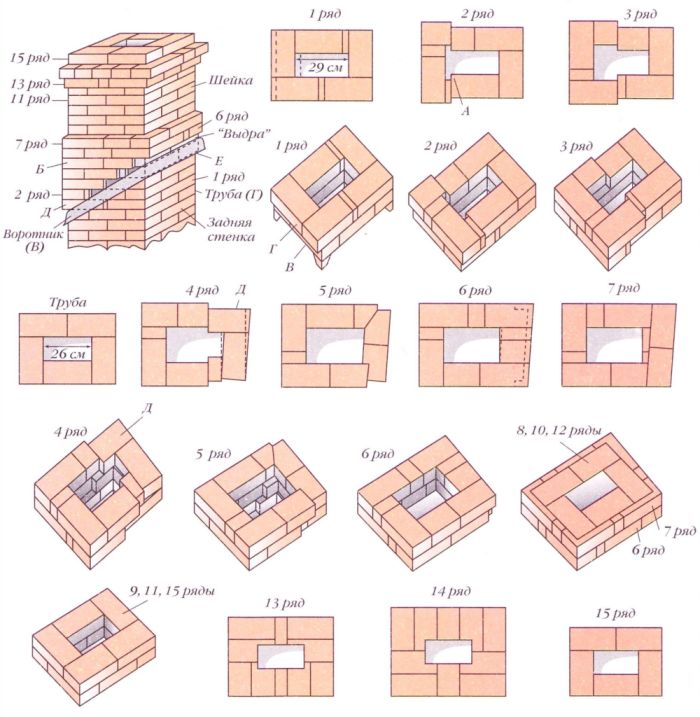 Схема на устройството и съставните елементи на тухлен комин