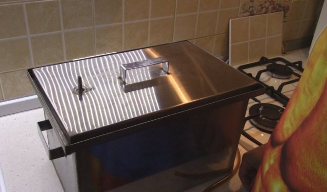Домашна пушилня за газова печка има свои специфики, което ви позволява да пушите, без да навредите на околната среда. За това устройството осигурява изход за дим или водно уплътнение, което не позволява димът да се разпространява из стаята. Капакът се затваря плътно.