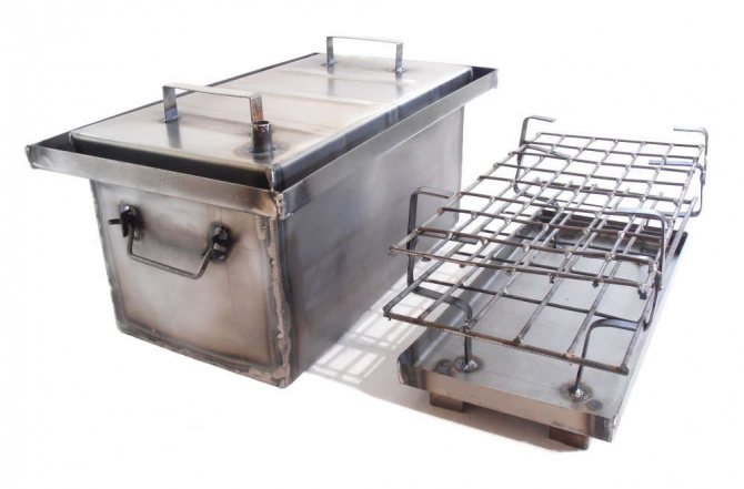 Горните дизайни на пушилни са чудесни за лятна вила или селска къща, но няма да можете да ги вземете със себе си на пикник или риболов - те са твърде обемисти. При полеви условия те ще бъдат успешно заменени мини-пушилня под формата на кутия с капаккакто на чертежа. Може да се направи ръчно и да се използва както в страната, така и да се транспортира в багажника на автомобил до място за почивка.