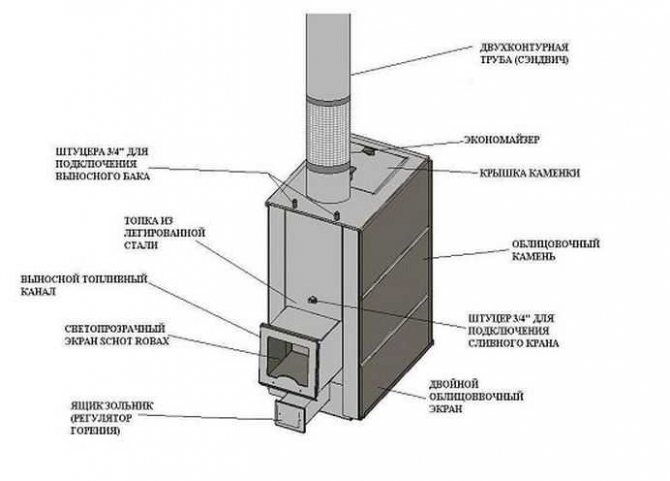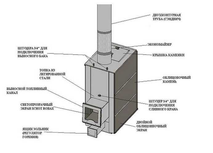 Куткин препоръчва да се инсталира икономизатор, който решава този проблем. В същото време той служи като източник на топлина за горния рафт, затопляйки лежащия там човек с помощта на топлината, излъчвана от камъните. Какво няма да се случи, ако поставите резервоар от тип самовар на тръба. Тогава външната стена на резервоара няма да бъде по-висока от 60-70 ° C и това изобщо не е температурата, при която се отделя топлина.