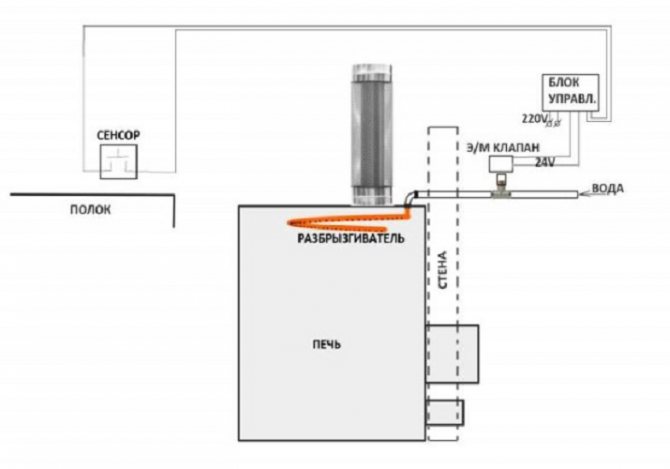 Има и втори начин - автоматизиран. За да направите това, водата се подава към пещта, електромеханичен клапан е инсталиран на тръбата (допълнително оборудване). Бутонът за управление е инсталиран на удобно място. Най-често - недалеч от рафта: имате нужда от пара, натиснат, без да ставате, получил порция вода в нагревателя. Освен това честотата на доставка е регулируема - от няколко секунди до 24 часа.