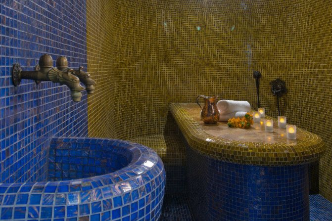 Режимът на турска баня се постига с много пара. Доведете температурата на парната до 45-50 ° C, изсипете няколко кофи с вода (около литър) в печката. В същото време камъните ще се изсипват, но ще има много пара. Водата активно ще кипи, ще излиза пара. След няколко десетки минути тя ще се повиши до 97%.