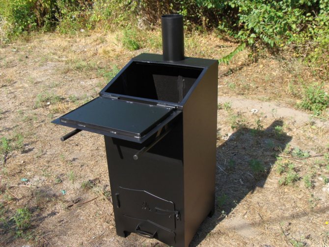 Изработени са от стомана с дебелина 2 мм, покрита с огнеупорен емайл. Малки размери, което улеснява транспортирането на печката в лек автомобил. Процесът на горене се извършва върху решетката, която задържа големи отпадъци и битови отпадъци, а също така не възпрепятства притока на въздух от долната част на пещта.