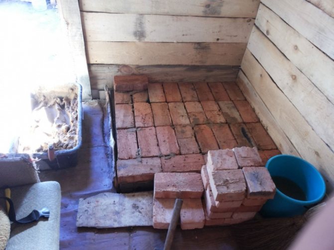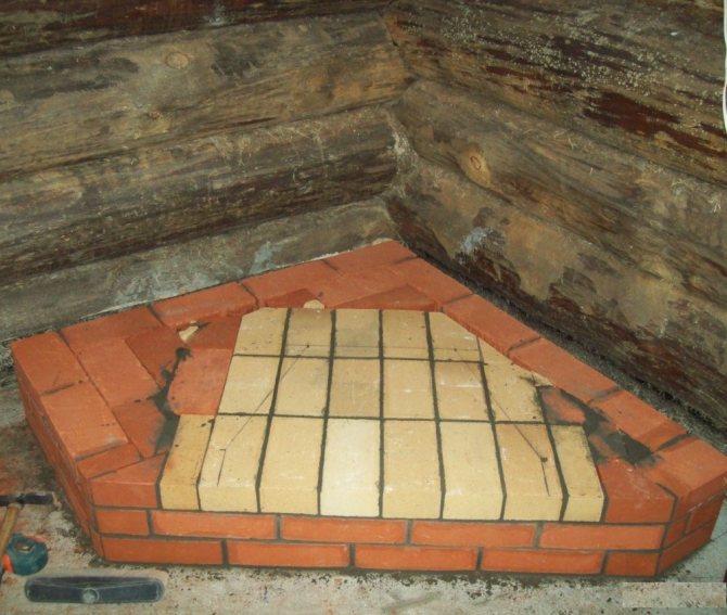Височината на основата, стърчаща над земната повърхност, е 20 см. Тя се „изважда“ под нивото на пода с помощта на топлоизолационен слой. Поставен е от топлоустойчиви тухли "твърдо". Решението е същият състав, който ще бъде приложен по-късно.