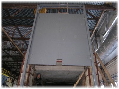 Външен изглед на тунелна пещ с камери за товарене и разтоварване в края на работния цикъл и с повдигнати врати