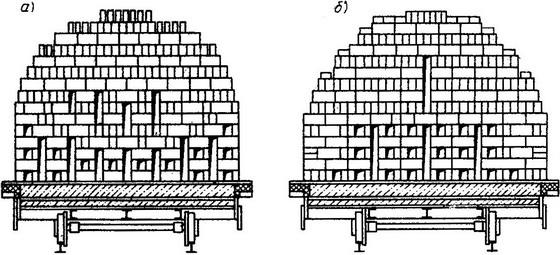 - Суровите тухли се поставят в няколко реда на палета на първата количка. В този случай височината на зареждане не трябва да надвишава 1 m, така че продуктите да не се деформират по време на процеса на калциниране.