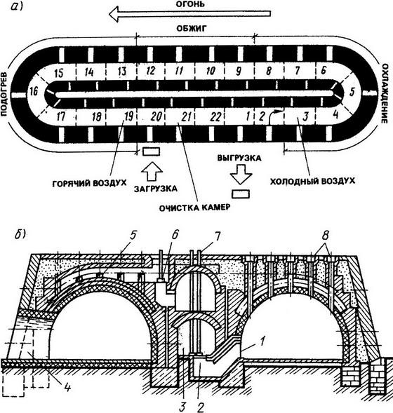 Принципът на действие на пещите от този тип е съвсем прост и се състои в това, че продуктите ще преминат през пълен цикъл на изпичане в една секция. Загряване за сметка на съседната камера, охлаждане от собственото си гориво и охлаждане, като се използва температурата на следващата секция. Това позволява значителни икономии и превръща работата в конвейер. (вижте също статията Тухла за облицовъчни печки и камини - общи изисквания и преглед на производителите)