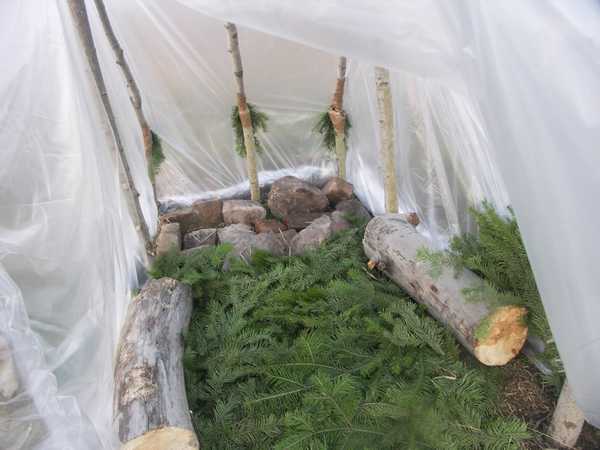 Ако имате сглобяема рамка, тогава можете веднага да я покриете с тента и да я оставите настрана. Когато дойде времето, няколко силни мъже лесно ще вдигнат тази конструкция и ще я покрият с пирамида от горещи камъни.