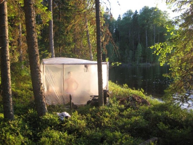 Ако не планирате да инсталирате къмпинг баня предварително, тогава можете да вземете обикновена пластмасова обвивка, за да покриете рамката. За да успее парната баня, трябва да познаете с нейния размер или да направите малки изчисления преди пътуването, започвайки от площ от 6 квадратни метра. Това количество ще бъде напълно достатъчно, за да се създаде добра парна баня сред природата.