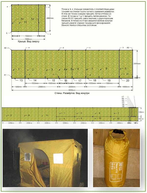 Но най-простият и доказан вариант е силната и удобна лагерна баня с печка. Цената му, заедно с шиене и аксесоари, е три пъти по-евтина от магазинната, която също е по-малка по размер. А спечелените пари могат да бъдат похарчени за добра печка за къмпинг, висококачествени камъни и, разбира се, месо за барбекю.