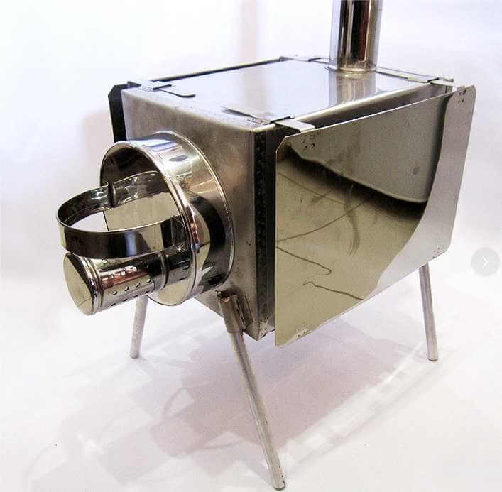 За домашно приготвена печка с дълго изгаряне се използват специални сгъваеми палатки с отвор за комин. Особено внимание трябва да се обърне на чертежа на самоделна метална печка. Размерите от 550 × 750 мм са отлични размери за изграждане на къмпинг пещ. Отделението за полагане на дърва за огрев по височина може да бъде направено същото като резервоара за вода, но вентилаторът трябва да е наполовина по-малък.