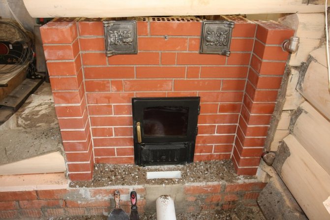Преди да започнете работа, подгответе здрава и равномерна основа. За да направите това, можете да попълните малък бетонен подиум. Облицовката на чугунната камина е направена в половин тухла, като между стените и облицовката се оставя въздушна възглавница с дебелина от 1 до 10 см. Освен това е необходимо да се осигурят малки вентилационни отвори в долната част на сградата - те ще осигурят изход на отопляем въздух и ще подобрят преноса на топлина.