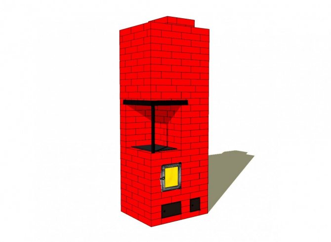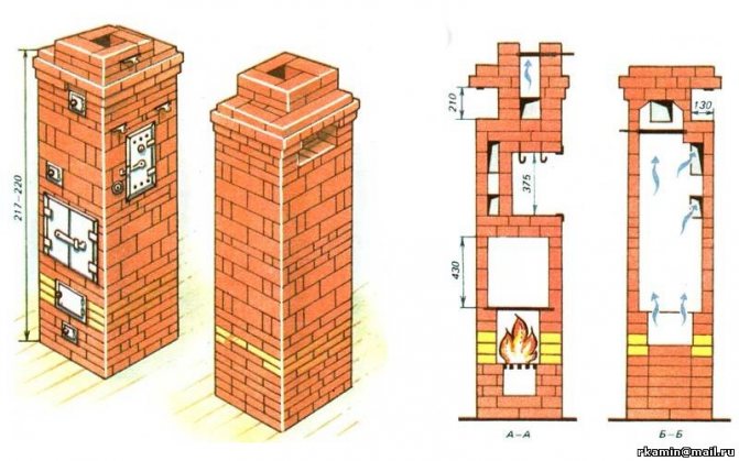 е публикуван в списание "Дом" № 10 за 2008 г. Автор на статията е А. Сушков от Санкт Петербург. Печката има добро нагряване на долната част, а в горната част има „звънец“, който забавя охлаждането на масата на печката след извършване на пещта. Освен всичко друго, дизайнът предвижда „летен“ курс, който улеснява запалването на печката и ви позволява да използвате печката за готвене, без да отоплявате стаята. Печката е оборудвана с чугунена печка с една горелка.Камината и камерата за готвене в този вариант на печката са разположени от широката страна на печката. Дълбочината на камината е 50 см. По време на конструкцията на печката трябва да се избере най-добрата налична тухла за камината, тъй като тук няма допълнителна облицовка. Това е разбираемо, тъй като тази печка няма да се отоплява всеки ден, а само от време на време, когато посещавате вилата и при подходящо време.Печката има размери в основата 64x77 см или 2,5x3 тухли, а нейната височина е само 203 см. височината може да бъде или намалена, или увеличена, в зависимост от това колко позволява таванът в дома ви. В същото време не трябва да се забравя, че от върха на печката до тавана трябва да останат поне 35 см. При посочените размери топлопреминаването ще бъде приблизително 1760 W с еднократна камина и 2940 W с двукратен. Размерът на отопляемото помещение при този капацитет ще бъде 18-22 м2.