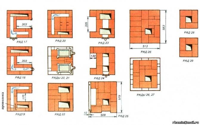 10 ред. С него започва образуването на комина. Той изгражда разширяване назад. Като се вземе предвид дизайнът на пещта на трохи, трябва да се помни, че инсталирането на тухлена надземна тръба е невъзможно поради изместения център на тежестта на цялата пещ.