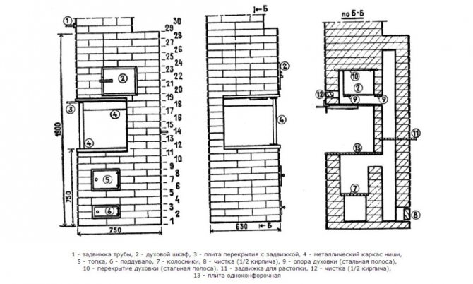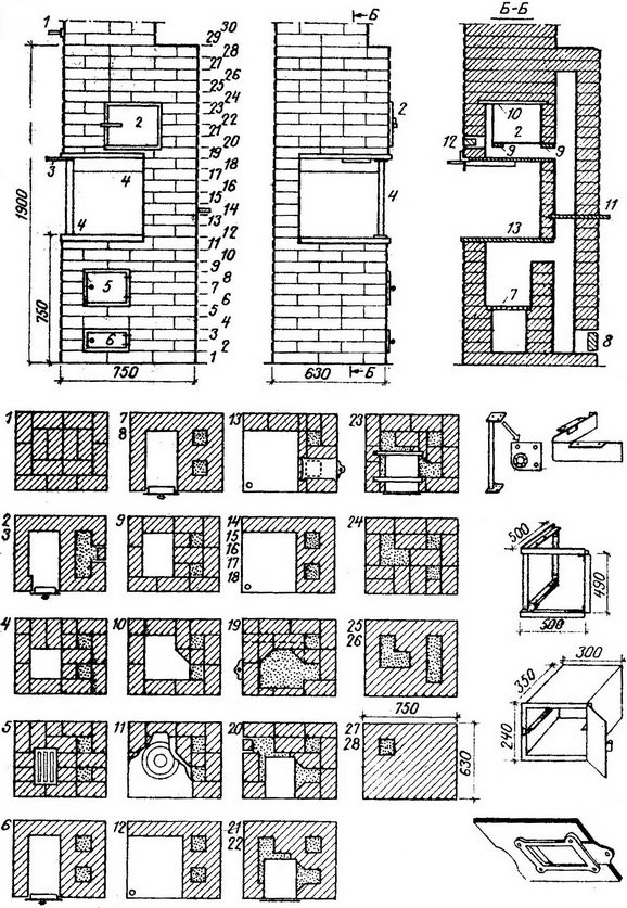 Печката е подходяща за лятна кухня; горивото се зарежда през голяма дупка в печка-1, в която халбите могат да бъдат заменени с капак от стара тенджера. Можете да отоплявате такава печка само с дърва. Пещта има духащ отвор без врата-2. За по-добро изгаряне в камината има решетки от цели тухли-3, които са монтирани на четвъртия ред. Газовете от пещта преминават през проходната стена-4, слизат надолу, загрявайки стените на пещта и се издигат нагоре в тръбата на щранга. Има прозорец за почистване на сажди-5, който е положен с тухла на ръба. Самоделен вентил от ламарина-6 може да се монтира там, където е удобно за собствениците. За клапана в основата на 27-ия ред се изтласква прорез с дълбочина 0,3-0,5 см. Височината на прореза се прави според дебелината на железния клапан, така че да няма повече от 0,2 см от хлабина над клапана и клапанът се движи свободно. Плочата е положена на 11-ти ред. Печката се загрява до пода и има минимум уреди за печка.