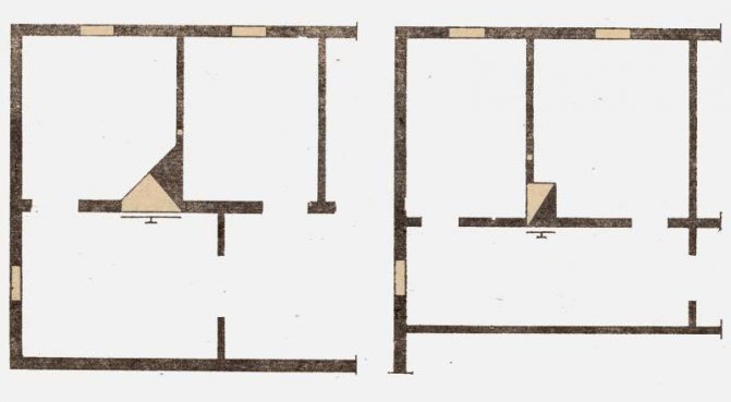 Такива конструкции са инсталирани в центъра на жилищната площ и по аналогия с печки за две стаи в дървена къща. Тази подредба осигурява най-стабилното и равномерно отопление от всички помещения.
