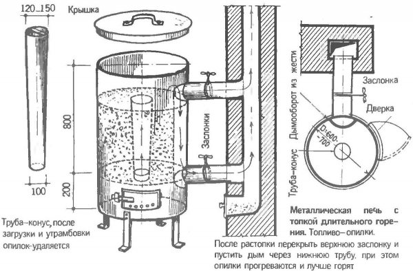 - В долната част на цилиндъра е направен отвор за отделението за гориво.От външната страна на цилиндъра коляно е фиксирано под тръба с диаметър 12 см за комина.