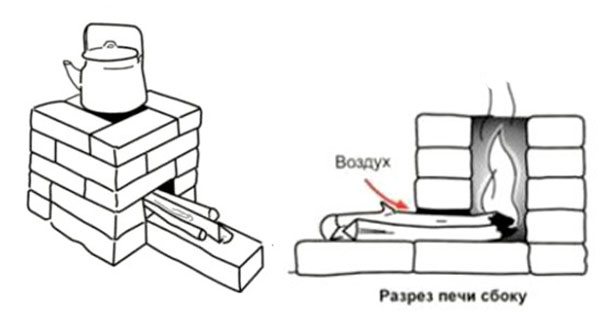 Първият тип е оборудван с удължен плот, върху който могат да се използват едновременно няколко контейнера. Вертикална тръба с камина и врата е разположена директно под печката, под която има и хоризонтален канал. Горещият въздух загрява котлона както директно, така и през канала. Външният модел има стабилни крака, които осигуряват надеждността и безопасността на конструкцията.