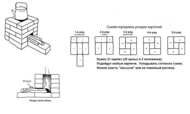 - Основата на печката е поставена от шамотни тухли. Повдигнете страничните стени, направете долния канал.