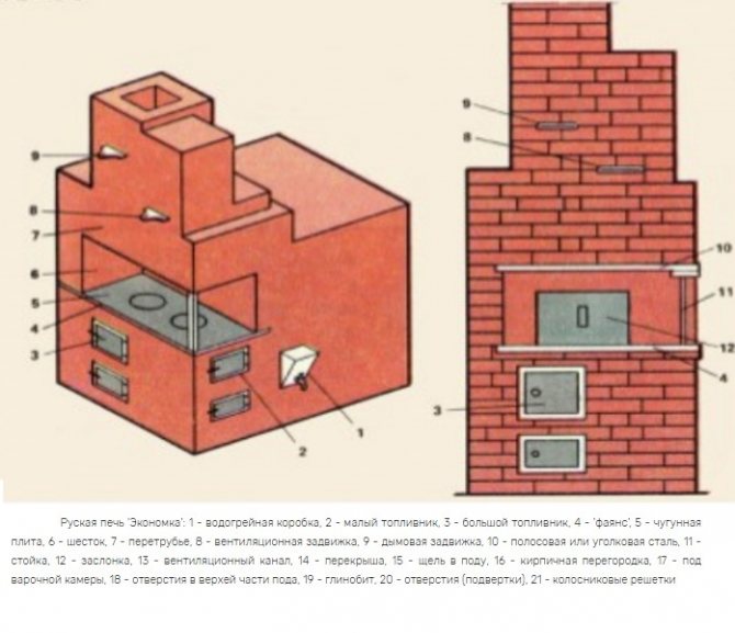 По отношение на външния вид класическата и икономичната фурна са доста сходни. Процесът на зидария също не е много по-различен.Тайната е в дизайна и избора на материали, които ще сведат до минимум топлинните загуби. Модифицираната пещ се състои от няколко камери, свързани с общ канал. Благодарение на тази функция топлината не се губи, а се концентрира отдолу. Камерата за готвене е снабдена с капак и може да се използва за готвене. От двете страни има отворен стълб, по контура на който от метален ъгъл е направена лента, наречена „фаянс“.