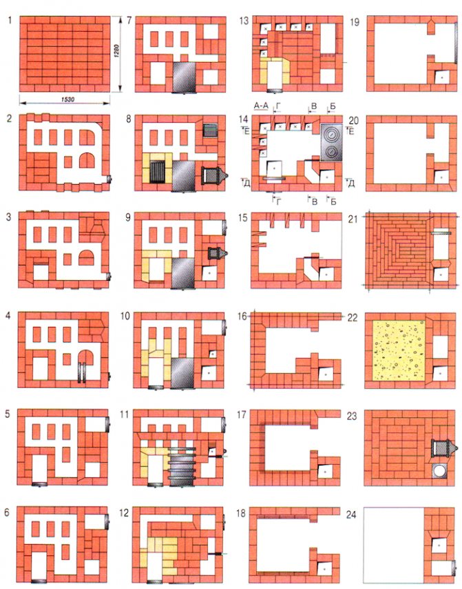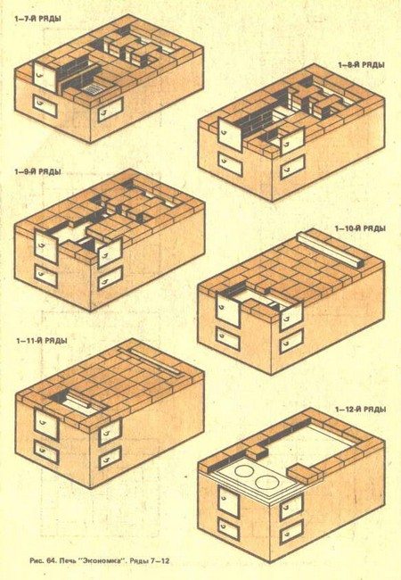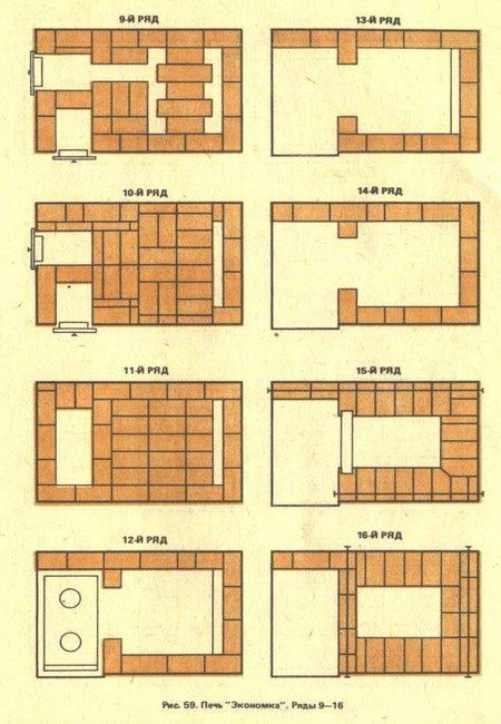 - Ред 10-12. Кутията за топла вода се припокрива и стените на камерата за готвене започват да се оформят, оформя се голяма камина.
