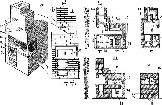 И двете долни горивни камери (2 и 3) имат свои собствени решетки и врати, над тях има чугунена плоча (5), с концентрични пръстени. Продуктите от горенето се движат по пътеката: малка горивна камера, голяма, след завоя на камерите за отопление и готвене. Достъпът до пространството, наречено шесто, е отворен от две страни. Ъгълът на окачване на горната тръба се поддържа на опора от ъгъл или тръба (11). За укрепване на най-външния полюс се използва метален ъгъл, който се нарича фаянс (4 и 10). Използва се 25-ти ъгъл с дебелина 3 мм, който е желателно, подобно на вратите, да бъде зазидан в шевовете с помощта на тел. Мястото за готвене може да бъде затворено с капак (12) с дръжка.