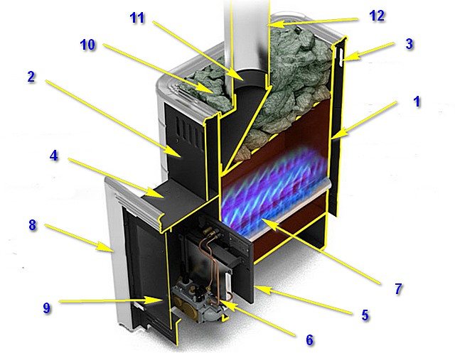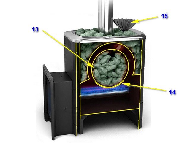 Естествено, всяка печка за сауна изисква нагревател. Отделението за полагане на камъни може да бъде разположено отгоре, както е показано на модела (поз. 10), по протежение на предната или страничните стени и понякога дори почти напълно да покрива цялото тяло на пещта.