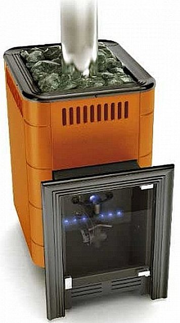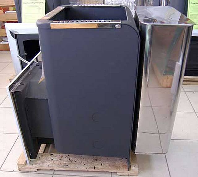 Ясно е, че такава печка не е оставена в "гол" вид в парната баня - тя трябва да бъде покрита с тухли или покрита с някакви екрани. Отгоре е осигурен кош за печка. Пещта се отличава с висока производителност, но, за съжаление, цената е твърде плашеща за нашите потребители, което дори е страшно да се спомене.