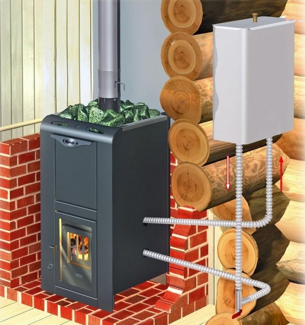- Вероятно трябва да помислите по въпроса как водата ще се нагрява във ваната предварително и да закупите подходящия резервоар, който е подходящ за избрания модел. Е, ако искате да спестите място в парната баня колкото е възможно повече, тогава е по-добре да занесете контейнера в пералнята, а парната баня да купи, с малко допълнително заплащане, модификация на печката с вграден топлообменник.