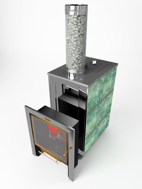 | Доста скъп, в сравнение с други, е модел на печка за сауна. Характерна особеност е декоративното външно покритие с естествен камък - избор на жадеит, серпентин или сапунен камък. Материалът на камината и корпуса е неръждаема стомана AISI 430. Режими на работа - руска, финландска или турска баня. Препоръчителен GSU - "OHG-2 Olympia" (Южна Корея). Централно разположение на комина с диаметър 115 mm. Скрит нагревател в тялото, плюс разположен по протежение на комина. Възможно е оборудвано с икономизатор за комина. Размери на пещта: 620 (Д) × 450 (Ш) × 900 (В) мм, тегло - 60 кг. Масата на каменната отметка е 80 ÷ 90 кг. | В основната конфигурация, без газово оборудване - от 43 000 рубли. |